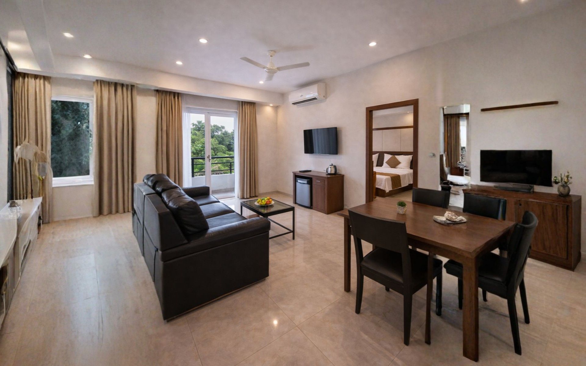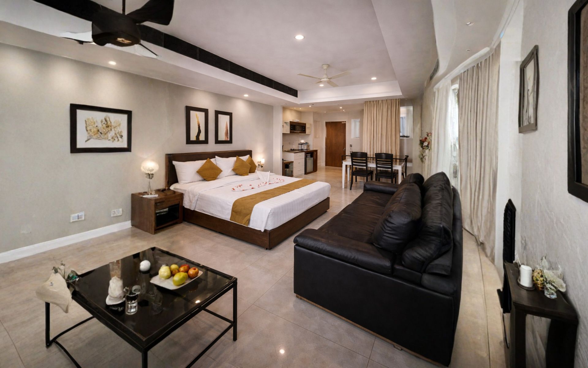Fully furnished 1 BHK apartment with a separate bedroom, living space and kitchen facilities, designed for comfortable short and long stays at Style Homes Suites.