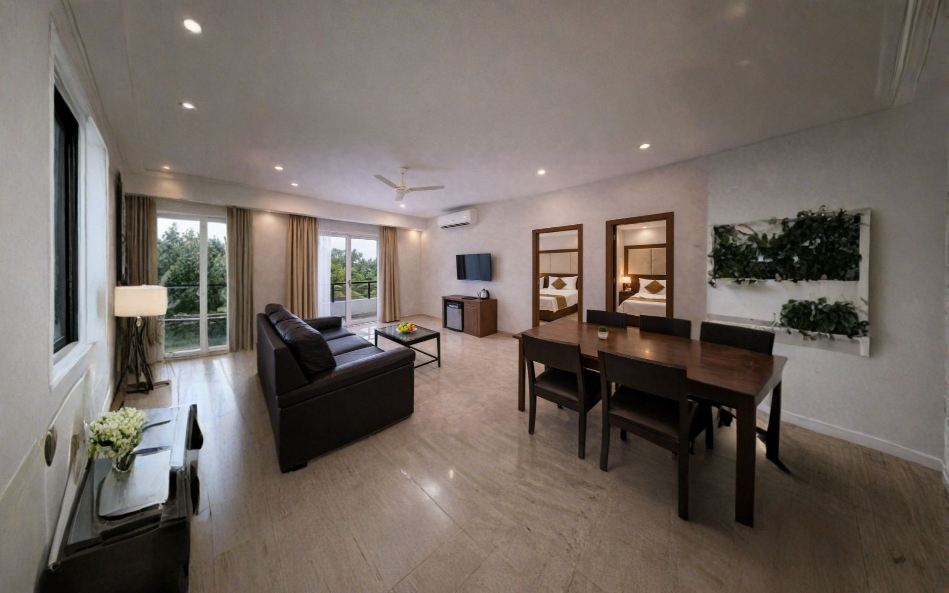 Spacious fully furnished 2 BHK apartment with two bedrooms, living area and kitchen facilities, ideal for families and long stays at Style Homes Suites.